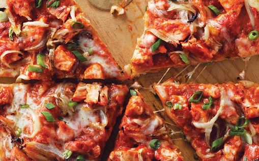 Butter Chicken Pizza with Basil Red Sauce, Chicken, Butter Sauce , Red Onion, Tomato Cheese